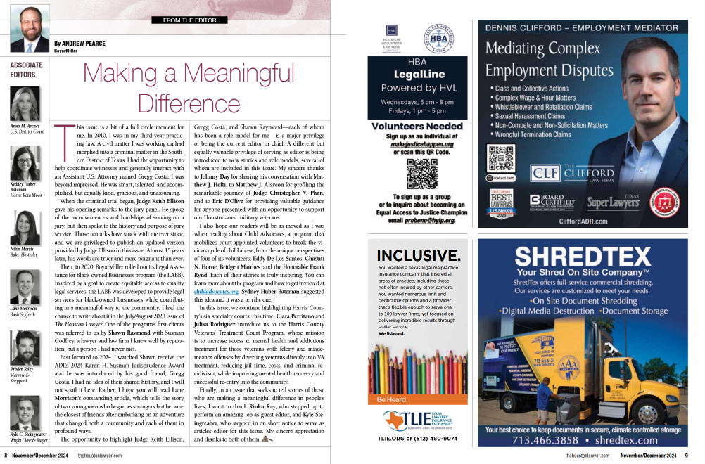 In this Editor’s Note by Andrew Pearce. he reflects on meaningful full-circle moments in his legal career—beginning with his early impressions of Judge Keith Ellison and former Assistant U.S. Attorney Gregg Costa, both of whom are featured in this issue of The Houston Lawyer. Pearce also revisits the launch of BoyarMiller’s Legal Assistance for Black-owned Businesses (LABB) program and its community impact. This edition highlights powerful personal and professional stories, including the friendship and shared journey of Shawn Raymond and Gregg Costa, the remarkable path of Judge Christopher V. Phan, and the inspiring work of Child Advocates volunteers. The issue also features insights into the Harris County Veterans’ Treatment Court Program and a tribute to dedicated veterans’ legal support. Through these stories, Pearce emphasizes the value of mentorship, service, and the legal community’s role in driving positive change.
